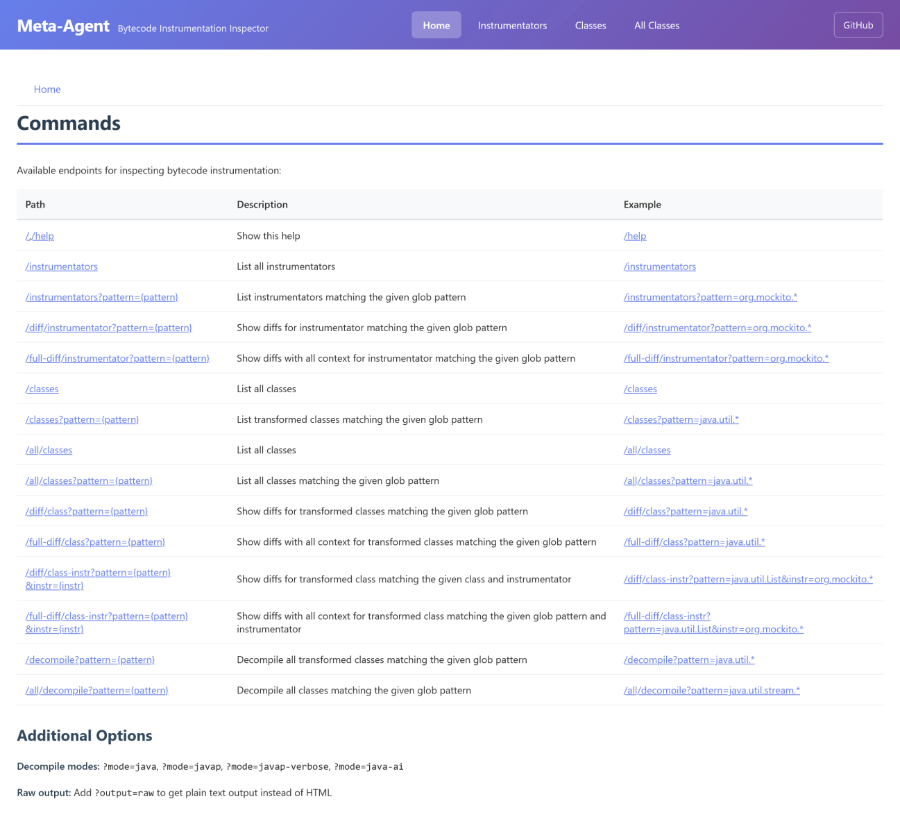 Among the things I discovered, there was meta-agent presented by Marco Sussitz during his talk: Demystifying OpenTelemetry: Java Agents Unveiled. This is a tool created by Johannes Bechberger and Mikaël Francoeur which was originally designed to investigate the generated bytecode from Spring proxies and Mockito mocks. Basically, you will have a hard time trying to debug (byte)code that is generated at runtime, whose source does not exist. Such proxies and mocks implementations only live in JVM memory so this tool provides a way to look at class file content that is loaded by the JVM. Internally, it works as a JVM agent that hooks into the Instrumentation API to decorate the other instrumenters and record their changes introduced through the ClassFileModifiers.